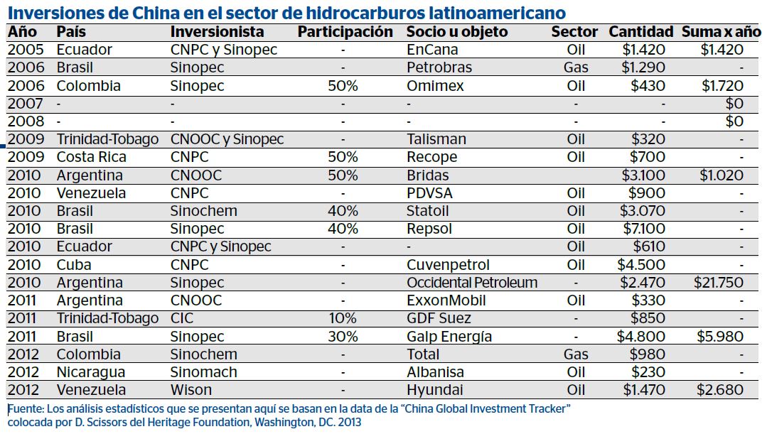 Desde 2005 hasta 2012, la suma de las inversiones energéticas de China fuera de su país en América Latina está en segundo lugar después de las inversiones en Estados Unidos y Canadá.